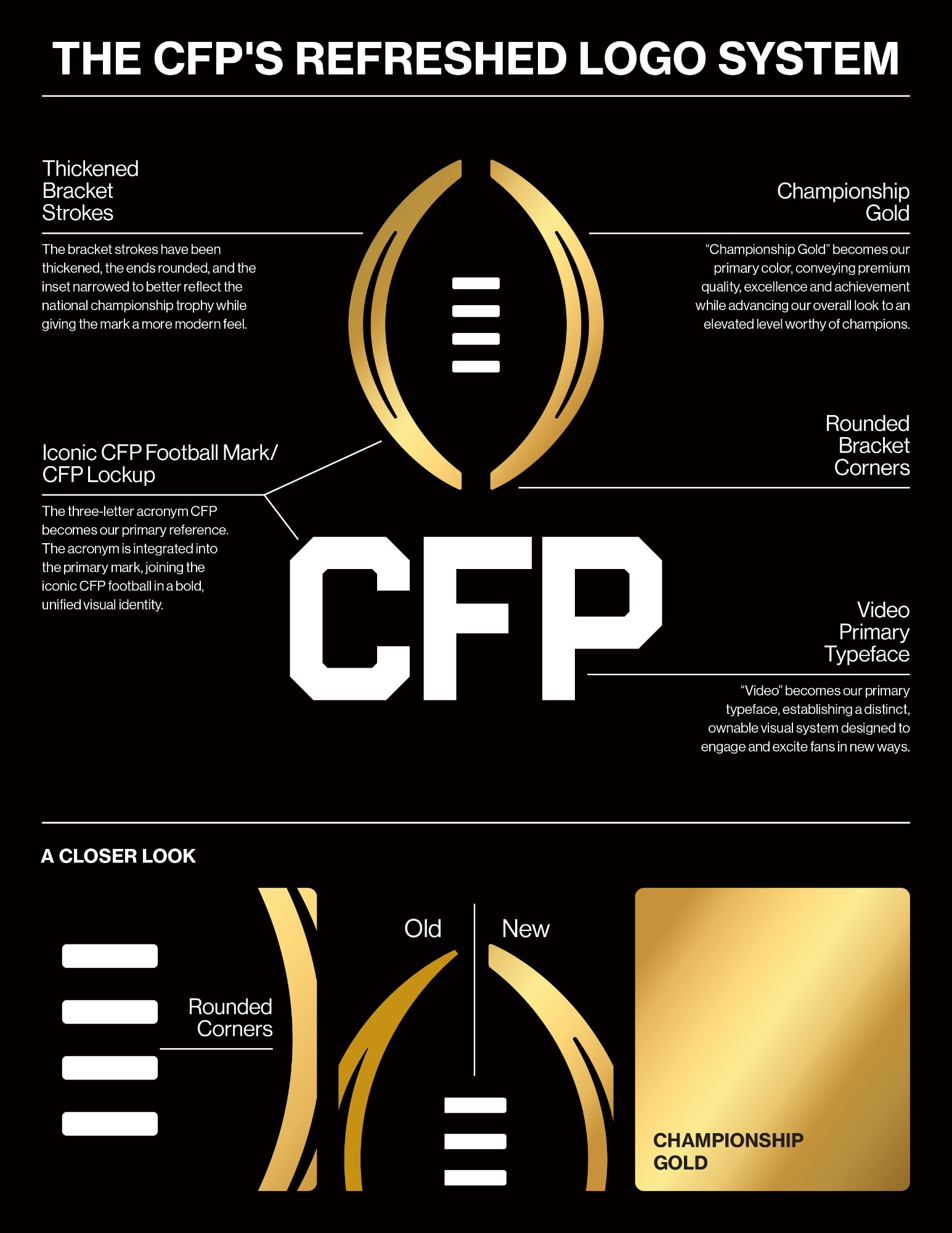 - The three-letter acronym "CFP" becomes a primary reference and is now integrated into the primary logo system, joining the iconic CFP football in a bold, unified visual identity.